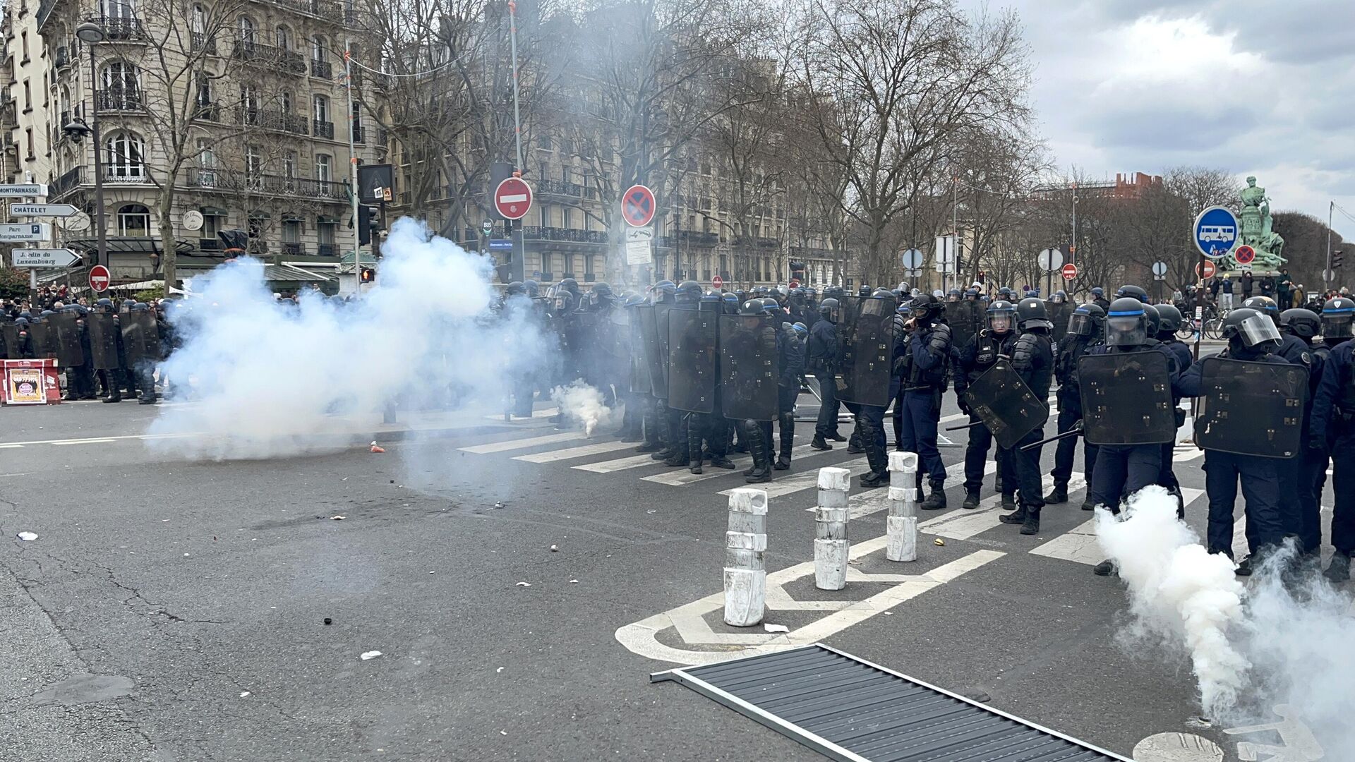 Several columns of demonstrators with the flags of leading French trade unions — CFDT, CGT, FO, Unsa, Solidaires and others — started marching from Boulevard Raspail in the 6th arrondissement of Paris towards Place d'Italie. They move behind the vans, from which the activists chant various slogans through megaphones: «Strike, lockdown, Macron, get out!», «We have fought and will continue to fight for retirement at 60!», «Macron, this is war!».