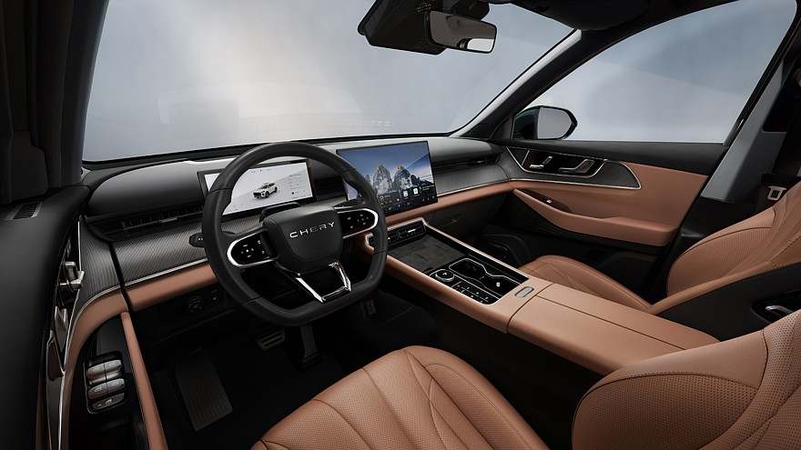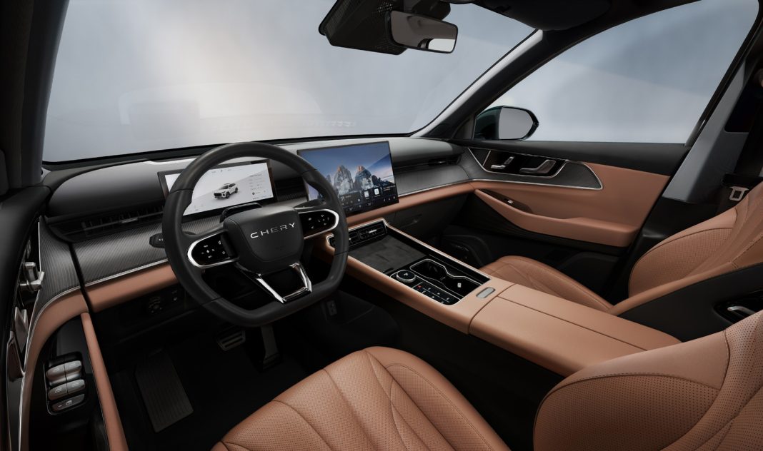 На фото: салон Chery Tiggo 9 для Российский рынок <стр>В центре передней панели расположен большой сенсорный экран (разрешение — UltraHD 2560 x 1440) информационно-развлекательной системы, его диагональ составляет 15,6 дюйма. Сиденья отделаны натуральной перфорированной кожей, водительское сиденье имеет электрорегулировки в восьми направлениях, поясничный подпор в четырех направлениях, а также функцию памяти, опционально доступна функция массажа.