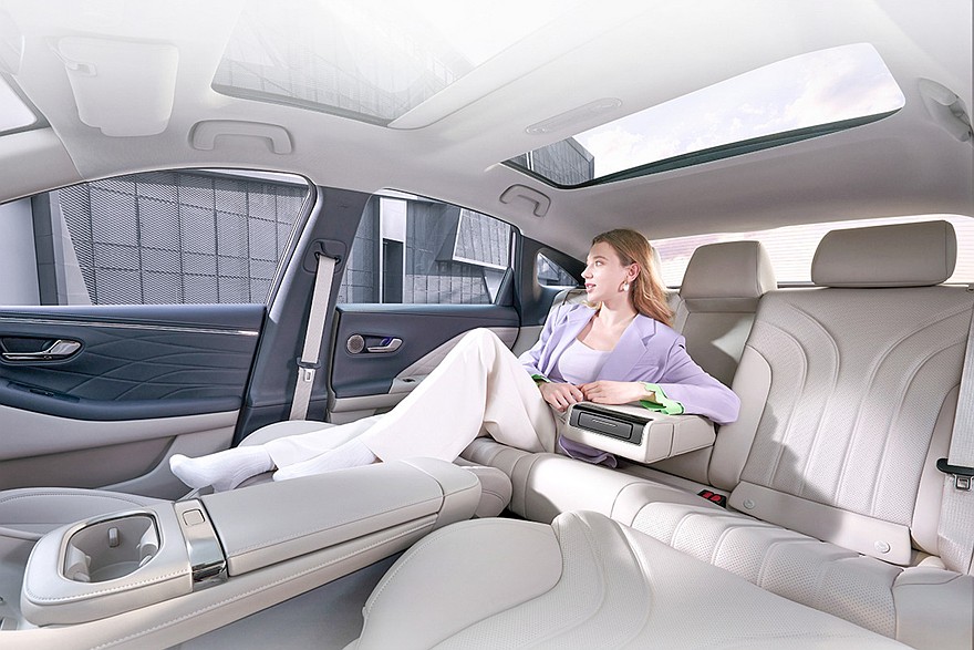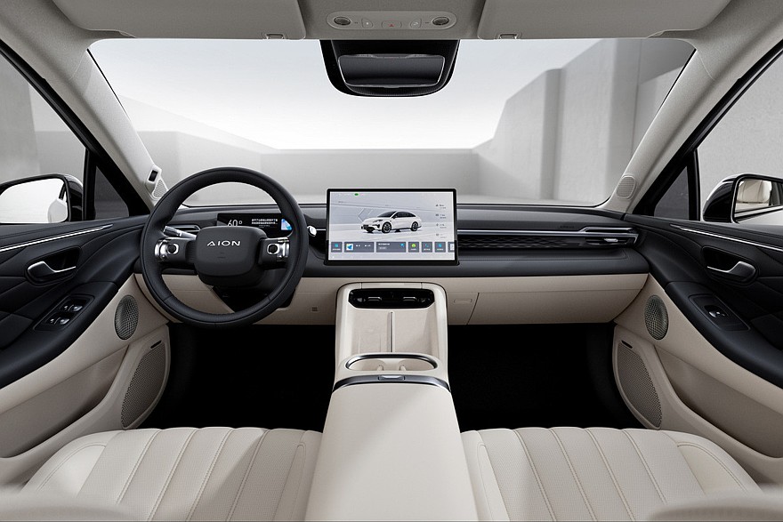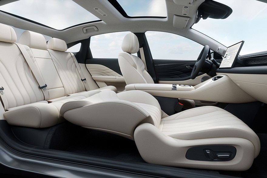 В салоне имеются отдельные экраны для комбинации приборов и мультимедийной системы (8,8 и 14,6 дюймов по диагонали соответственно) и двухэтажный центральный тоннель, на котором расположены беспроводная зарядка для смартфона и пара открытых подстаканников. Крыша имеет две стеклянные секции. Полного описания всех комплектаций пока нет, но известно, что дорогие версии оснащены лидаром, множеством датчиков и радаров.