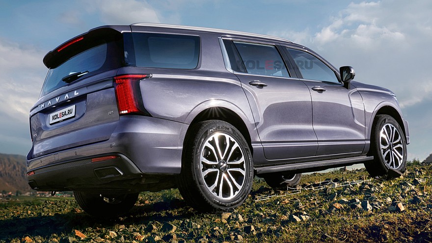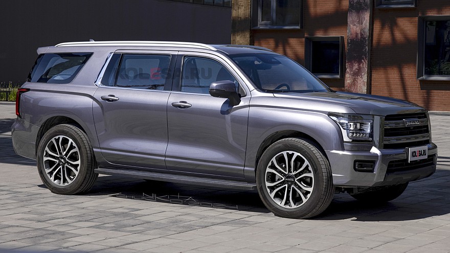 Это самым непосредственным образом отразилось на габаритах модели: ее длина составляет 5190 мм, колесная база — 3140 мм. Для сравнения, длина Haval H5 первого поколения составляет 4649, расстояние между осями — 2700 мм. При столь огромных размерах кузова колеса должны быть соответствующими, однако в реальности они почти теряются в арках, создавая привычную для многих «китайцев» картину массивного кузова на небольших узких ножках. Изображенный на рендерах внедорожник получил немного увеличенные колесные арки и существенно увеличенные диски (если в оригинале они имеют размер 18 дюймов, то представленные на рендерах — ближе к 20 дюймам).