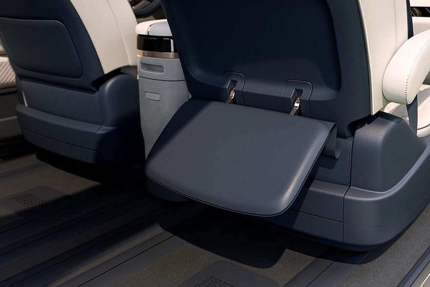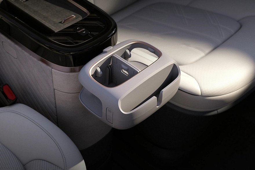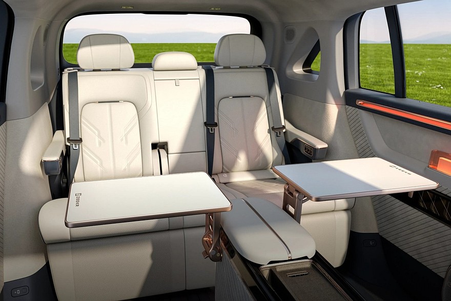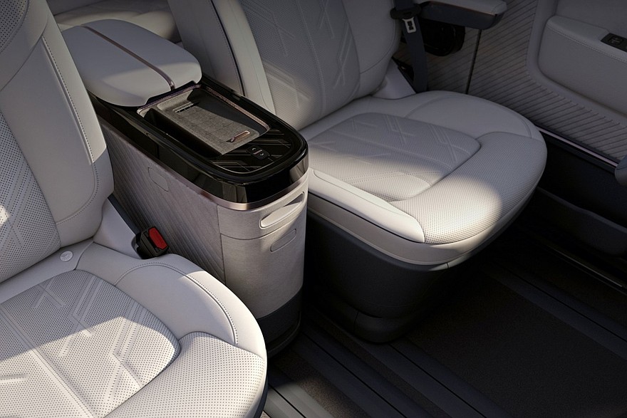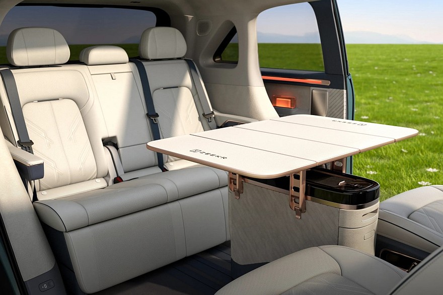 В салоне предусмотрены отдельные экраны для панели приборов и мультимедийной системы. Передние сиденья можно развернуть лицом к галерке. Кроме того, имеется выдвижной шкаф с холодильником и отделением для мелочей: по умолчанию он расположен между передними сиденьями, а если его выкатить и разложить спрятанный в нем столик, то салон можно превратить в уютную гостиную.