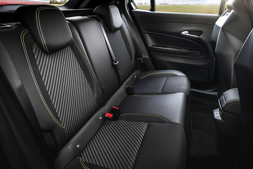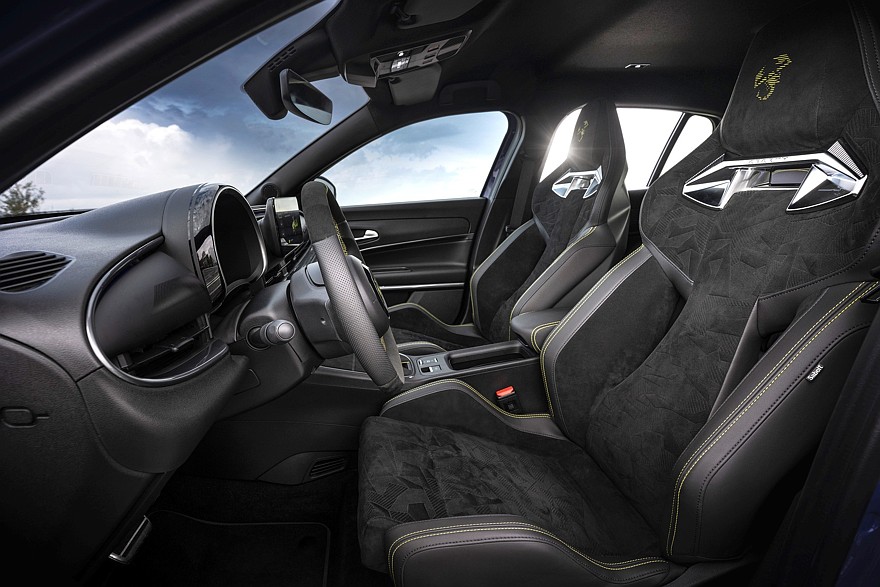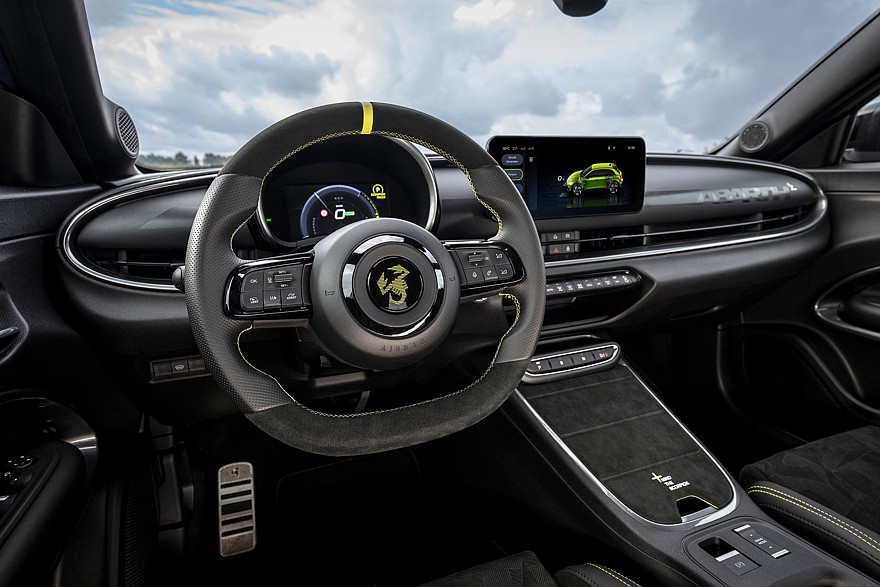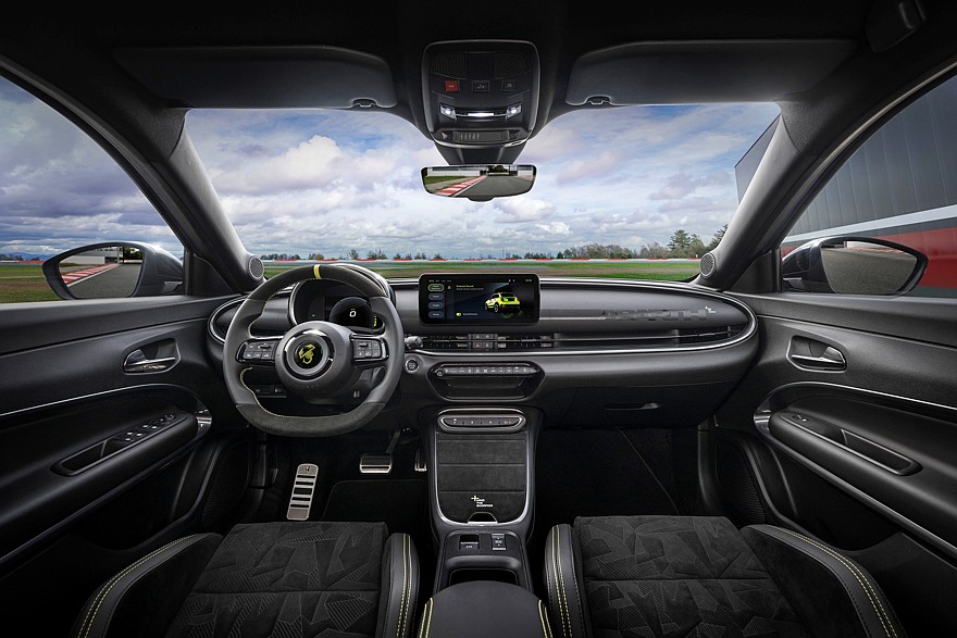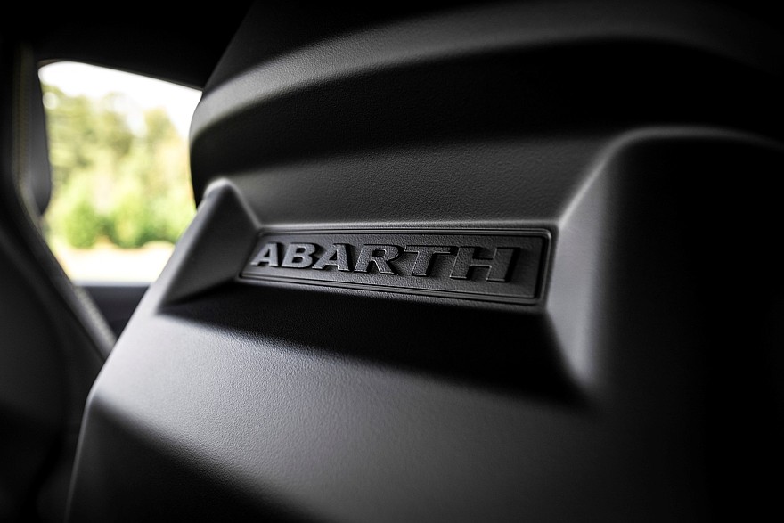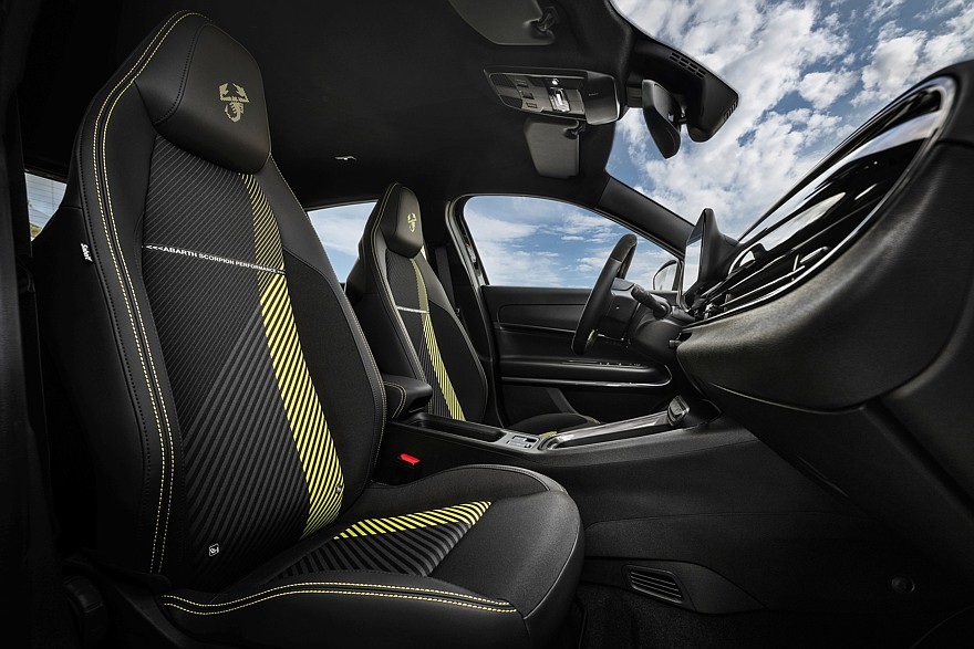 Салон Abarth 600e отличается от салона Fiat 600e более пухлым рулевым колесом с замшевыми вставками и меткой центрального положения, оригинальной графикой экранов приборов и мультимедиа (7 и 10,25 дюймов соответственно), темной отделкой потолка и стоек кузова, алюминиевыми накладки на педали и спортивные передние сиденья Sabelt. Версия Scorpionissima имеет сиденья Sabelt с более глубокими и перфорированными спинками, а также усовершенствованную обивку с четырьмя пенными наполнителями разной плотности — они обеспечивают хороший баланс комфорта и боковой поддержки. Версия Scorpionissima также оснащена настраиваемым генератором искусственного шума, который может имитировать звук двигателя внутреннего сгорания по усмотрению водителя.