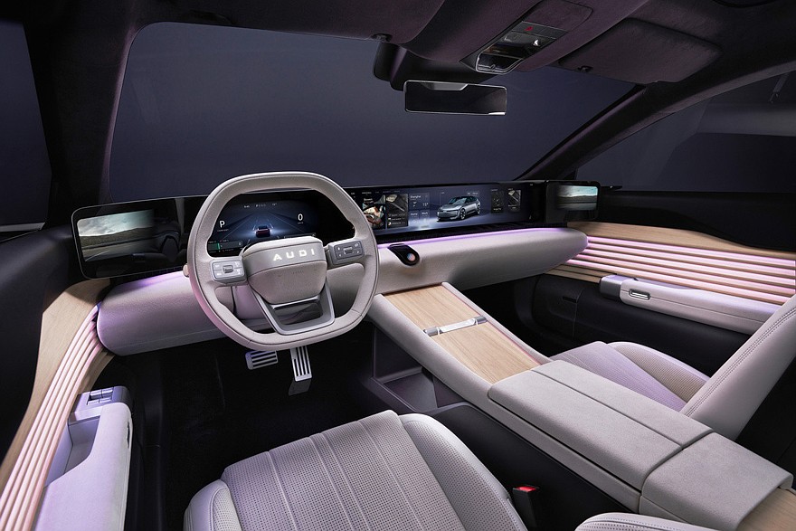 4/4 < стр>В салоне — изогнутая приборная панель во всю ширину передней панели (на боковых дисплеях отображается изображение с внешних камер) и двухэтажный центральный тоннель. Кроме того, в AUDI E есть виртуальный помощник.