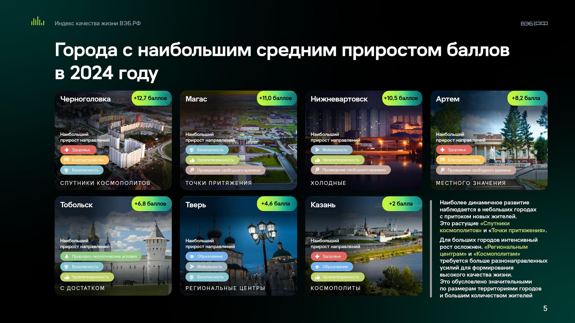 «По результатам комплексной актуализации данных в системе Индекса качества жизни ВЭБ.РФ наилучшую динамику показали Артем, Казань, Магас, Нижневартовск, Тверь, Тобольск и Черноголовка», — говорится в сообщении.