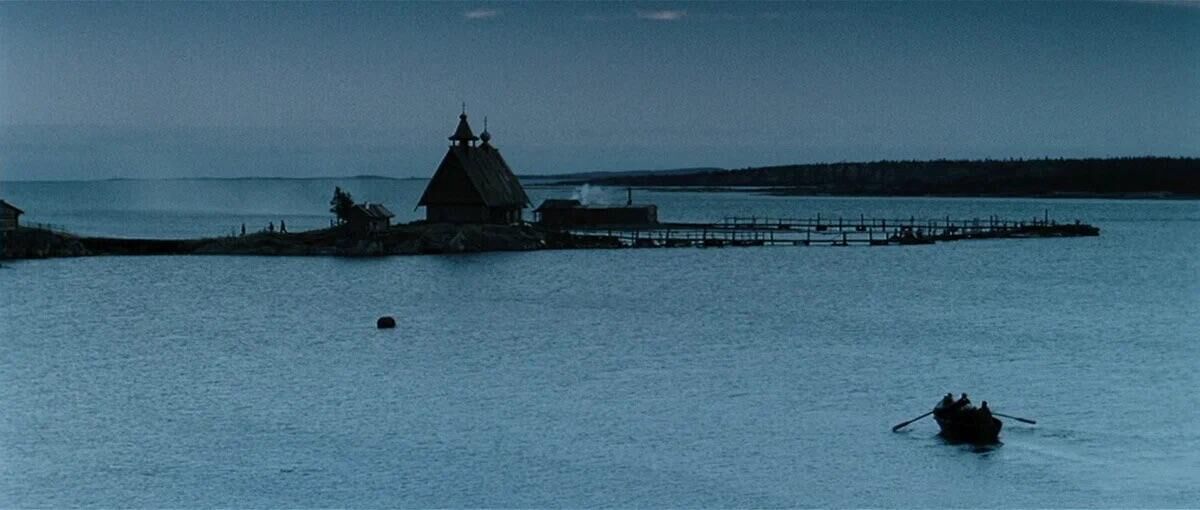 Фильм Павла Лунгина «Остров» снимался в городе Кемь в Карелии, на берегу Белого моря. Оттуда отправляются лодки на Соловки. Постройки в кадре не настоящие — их сделали специально для съемок, но тогда их не убрали. Постепенно они пришли в упадок, а недавно самый заметный из объектов — изба-церковь — сгорел. Но некоторые остатки декораций все еще можно найти, и в то же время можно насладиться суровыми и прекрасными видами.