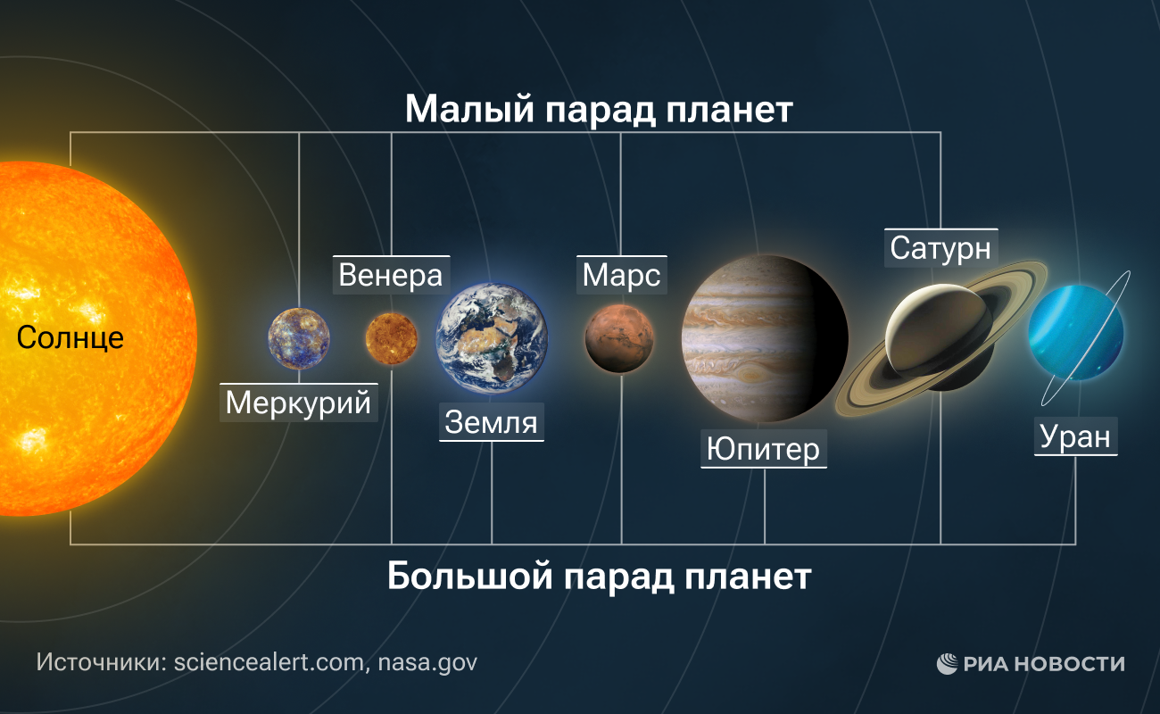 Парад планет – зрелищное астрономическое событие, когда планеты на небосводе выстраиваются в линию по одну сторону Солнца. В научной среде это событие называют «выравниванием». Оптический эффект линейного размещения планет вызван их положением относительно взгляда наблюдателя. В реальности же все космические объекты продолжают двигаться по своим орбитам.