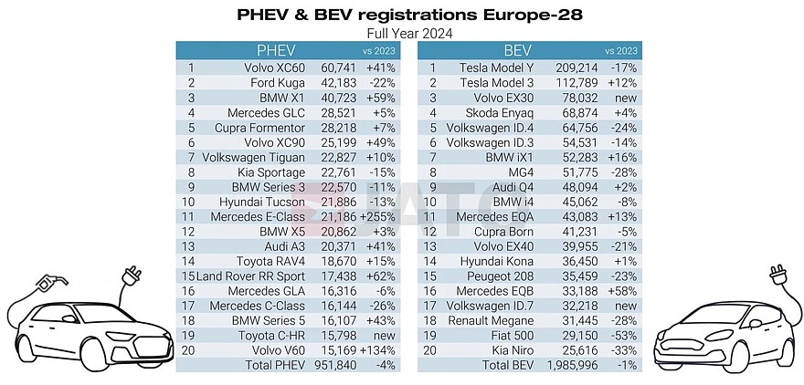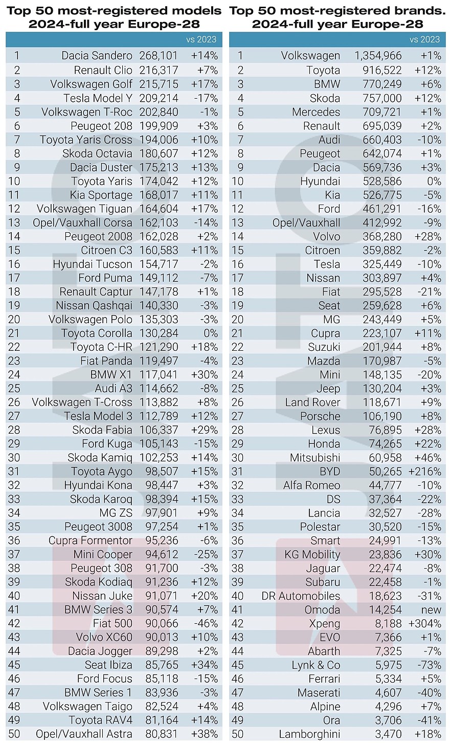 <стр>Для простоты изложения будем приравнивать регистрации к продажам: только в прошлом году, по данным JATO Dynamics, продажи новых легковых автомобилей в Европе составили 12 909 741 единиц, что на 0,9% больше продаж в 2023 году. Ниже приведены списки 50 самых популярных моделей и марок.стр>