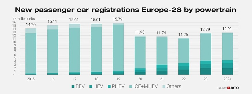 Аналитическое агентство JATO Dynamics опубликовало статистику по регистрациям новых легковых автомобилей в Европе за весь 2024 год и с помощью инфографики показало основные тенденции ее развития.