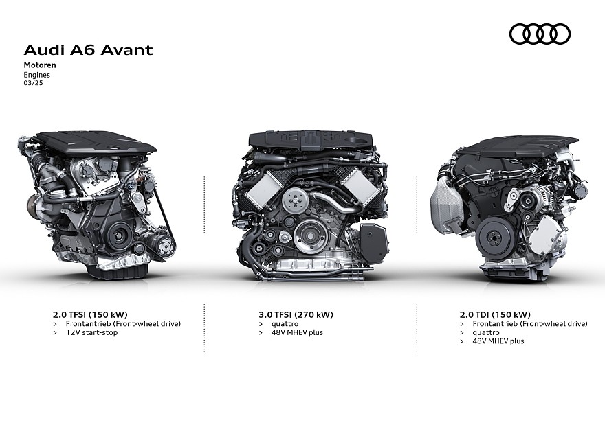 На данный момент для нового Audi A6 Avant заявлены только три двигателя на выбор: бензиновая «турбочетвёрка» 2.0 TFSI (204 л.с., 340 Нм), турбодизель 2.0 TDI (204 л.с., 400 Нм) и бензиновый турбомотор V6 3.0 TFSI (367 л.с., 550 Нм). Коробка передач — только 7-ступенчатый «робот» S tronic c двумя сцеплениям. Версия с мотором 2.0 TFSI предлагается только с передним приводом. Дизельный универсал может иметь как передний, так и полный привод. Версия с мотором V6 идёт в комплекте с полным приводом и может быть дополнена активным задним дифференциалом.