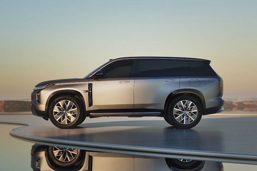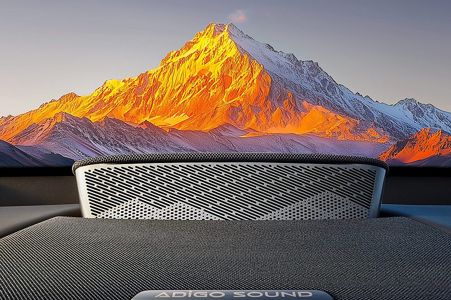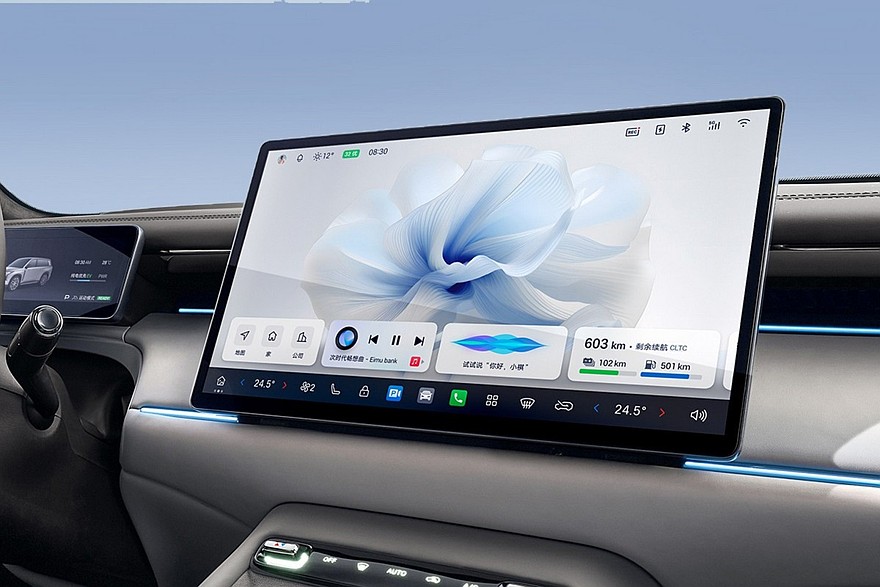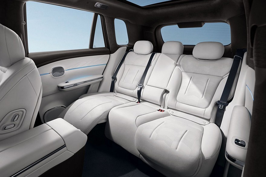 Внутри – отдельные экраны приборки и мультимедийной системы (8,88 и 15,6 дюйма соответственно), двухспицевый руль и двухэтажный тоннель. Для задних седоков предусмотрен свой дисплей на 17,3 дюйма – он крепится к потолку. Физических клавиш почти нет. За управление трансмиссией отвечает подрулевой рычажок. Центральный динамик аудиосистемы появляется прямо из передней панели.