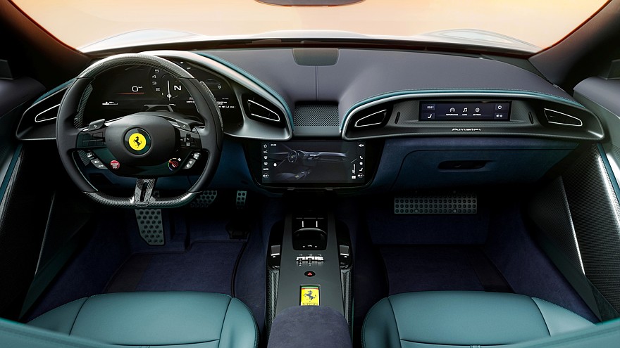 Салон у Ferrari Amalfi полностью новый: по сравнению с Roma переделаны кресла, передняя панель, центральный тоннель, дверные карты и даже отделка пола. Руль похож на прежний, но он, к счастью, лишился сенсорных панелей — теперь только физические кнопки. На смену вертикальному центральном мультимедийному экрану пришёл горизонтальный, 10,25-дюймовый. Приборный 15,6-дюймовый экран получил обновлённую графику. Переднему пассажиру по-прежнему положен свой 8,8-дюймовый «штурманский» монитор.