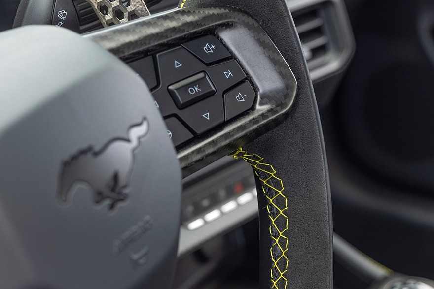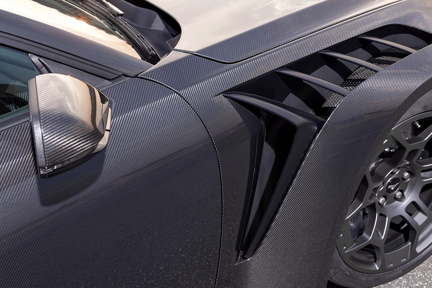 Уже ставший легендарным Ford Mustang GTD теперь доступен без краски, с выставленными напоказ лакированными углепластиковыми панелями кузова, причём теперь из углепластика в кузове выполнено всё, что можно.