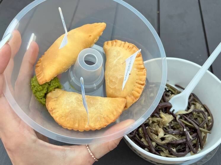 Три мини-чебурека с крабом (720 руб.) (подают их в небольшой картонной коробке) выглядят аккуратно — золотистая корочка, чуть заметная влага от начинки. На деле это скорее закуска. Съесть можно, но рассчитывать на полноценный обед не стоит. Соотношение тесто/начинка — приемлемое: теста не больше, чем надо, и оно не «подавляет» вкуса, краб читается. Соус из черемши, которым предлагают дополнить чебуреки, скорее эстетичен, чем выразителен: аромат есть, остроты и свежести — мало.