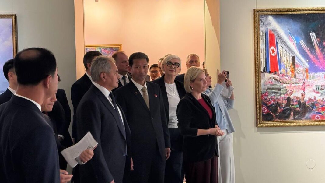 Шойгу вместе с министром культуры КНДР Сын Чон Гю и министром культуры РФ Ольгой Любимовой обошли выставку. Они, в частности, осмотрели картины, посвященные участию военнослужащих КНДР в освобождении Курской области, в том числе полотно «В одном окопе». На этой картине запечатлены торжествующие российские и северокорейские бойцы на фоне государственных флагов России и КНДР.