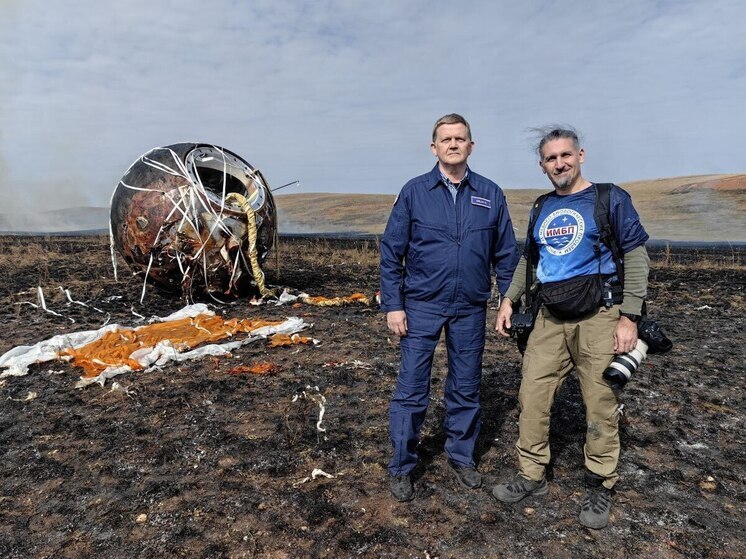 СПУСКАЕМЫЙ АППАРАТ «БИОНА-М»№2 НА ЗЕМЛЕ. ЕГО ВСТРЕТИЛИ ДИРЕКТОР ИМБП РАН ОЛЕГ ОРЛОВ И ПРЕДСТАВИТЕЛЬ ПРЕСС-СЛУЖБЫ ИНСТИТУТА ОЛЕГ ВОЛОШИН. СНИМОК ПРЕДОСТАВЛЕН ИМБП РАН. АВТОР ОЛЕГ ВОЛОШИН