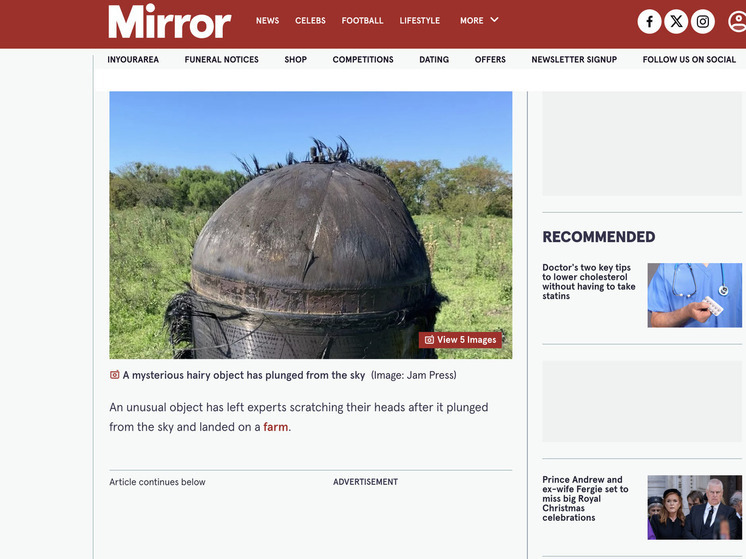 На территории фермы в аргентинском городе Пуэрто-Тироль упал крупный цилиндрический объект неизвестного происхождения, покрытый черными волокнами, напоминающими волосы и перья. Об этом сообщает издание The Mirror.