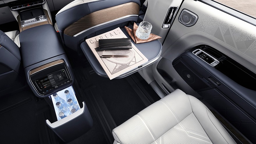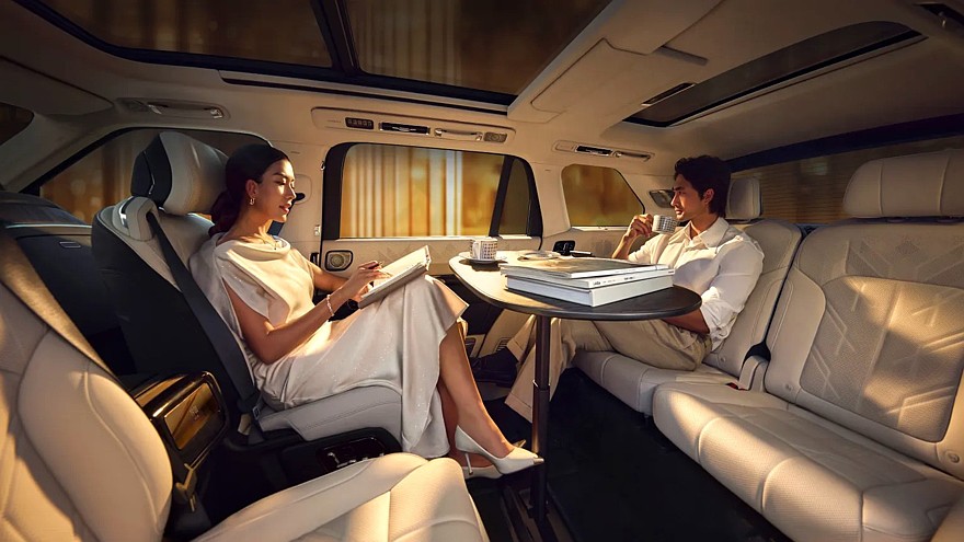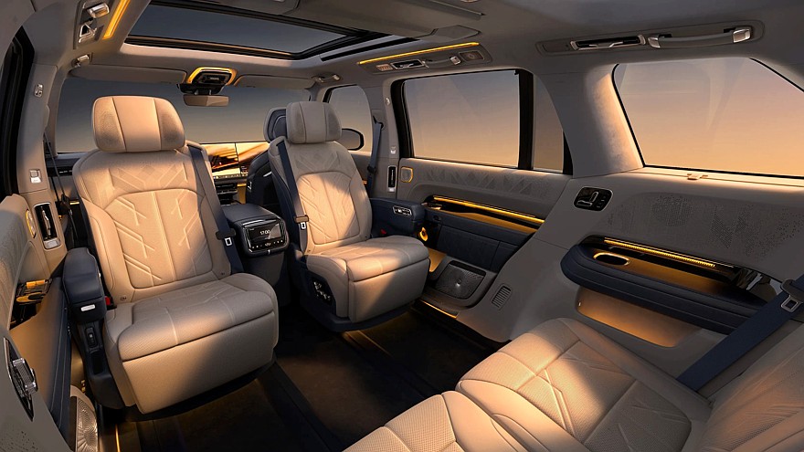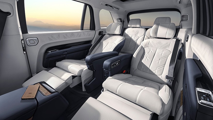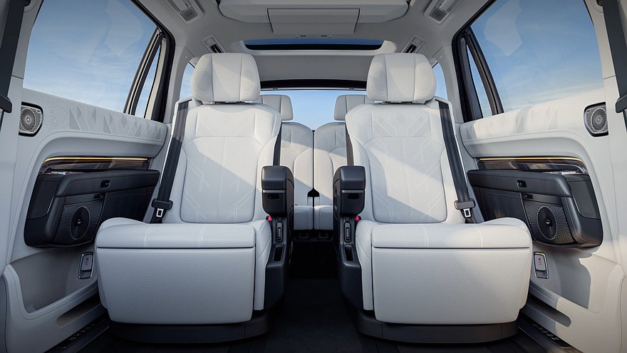 Салон Zeekr 9X имеет посадочную формулу 2+2+2, даже галёрка здесь состоит из двух раздельных «взрослых» кресел, хотя и не таких комфортных как в первом и втором рядах, где есть массаж и прочие удобства. Кресла второго ряда можно разворачивать на 180 градусов, что организовать мобильную переговорную. Бумажки, еду и напитки можно раскладывать на быстро монтируемом столике. Шампанское и минералку можно остудить в бортовом 9-литровом холодильнике. Для пассажиров второго ряда предусмотрены персональные столики в спинках передних кресел и 6,3-дюймовый настроечный планшет. В потолок вмонтирована передвижная консоль с 17-дюймовым телевизором для пассажиров. Штатная аудиосистема мощностью 3868 Вт насчитывает 32 динамика, караоке работает без микрофона.