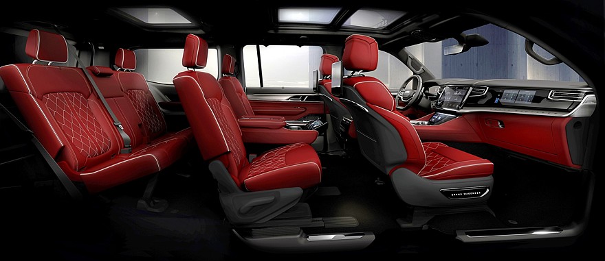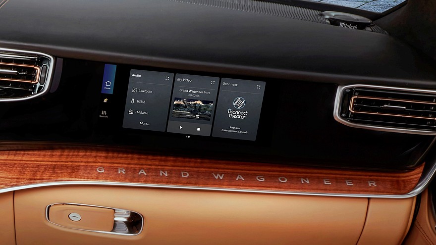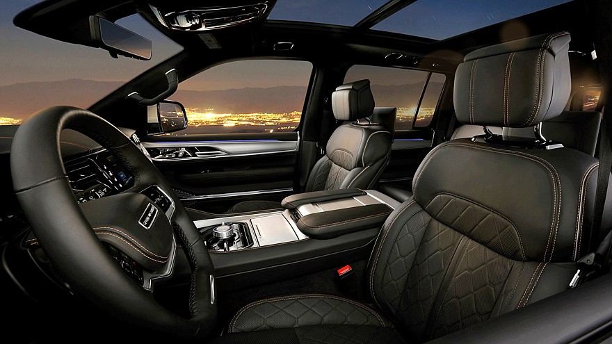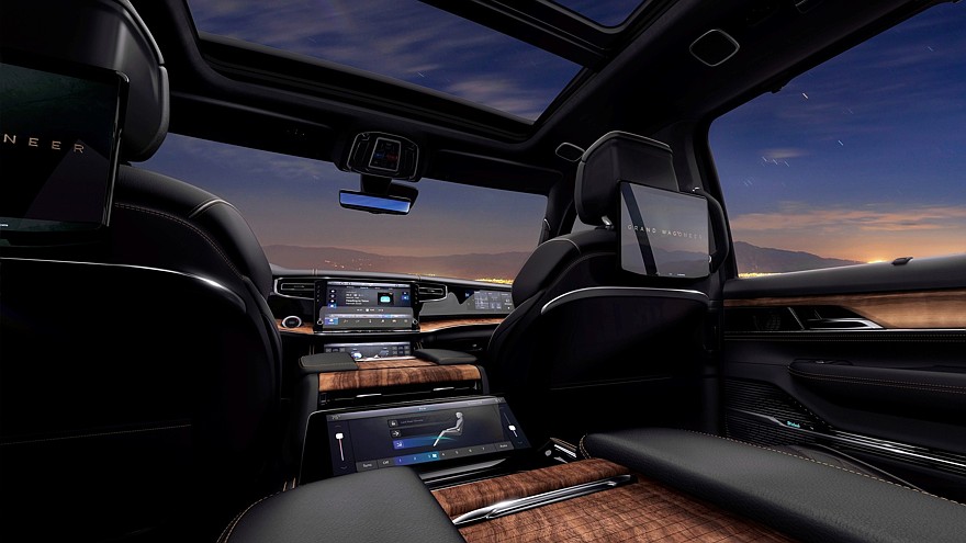 Между тем в салоне Jeep Grand Wagoneer блестящие детальки остались, принципиальных изменений здесь нет, но улучшены отделочные материалы, а проекционный экран на лобовом стекле стал шире и информативнее. Штатная аудиосистема McIntosh в зависимости от комплектации насчитывает 19 либо 23 громкоговорителя. Для пассажиров второго ряда доступны вентиляция сидений и собственные мультимедийные экраны.