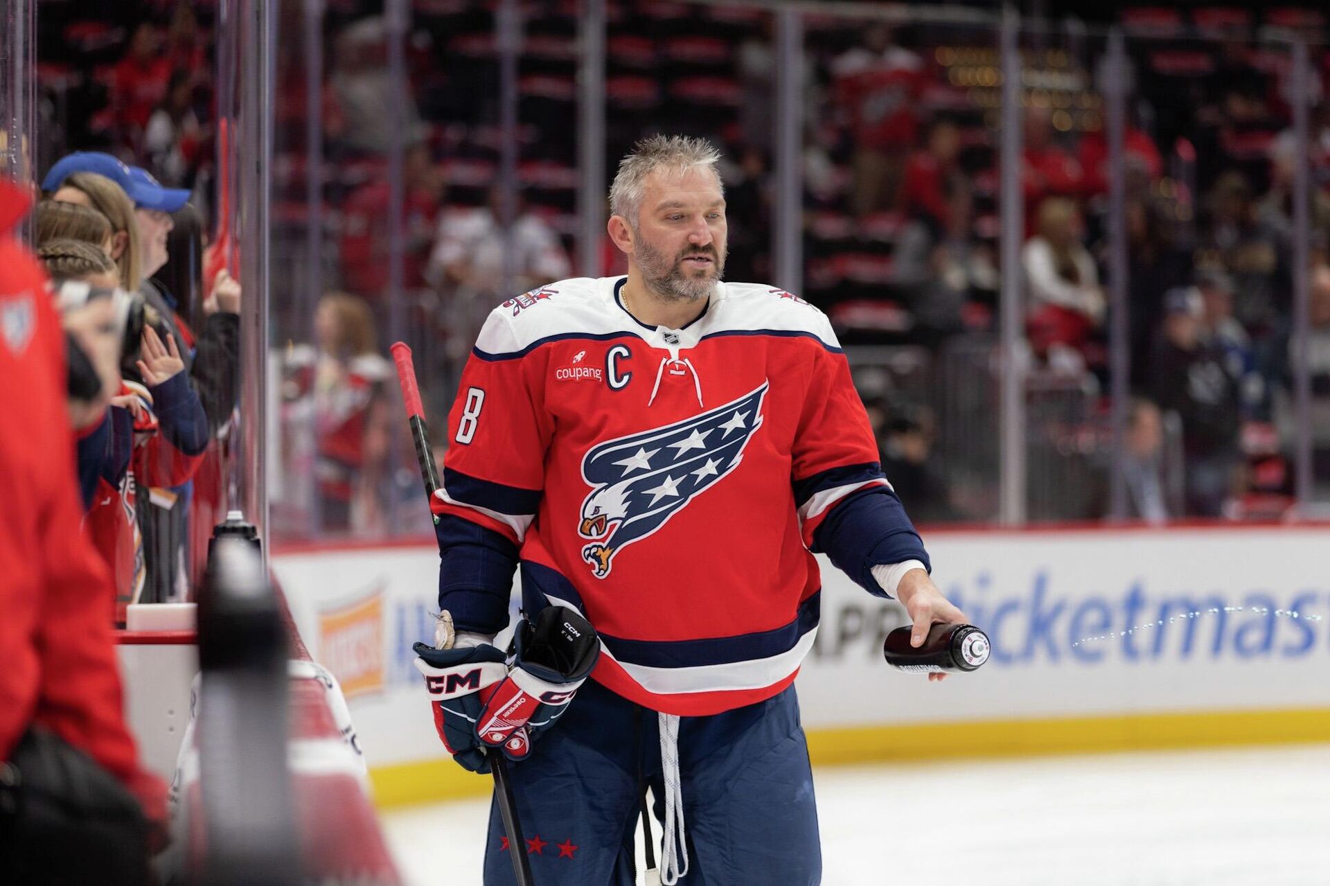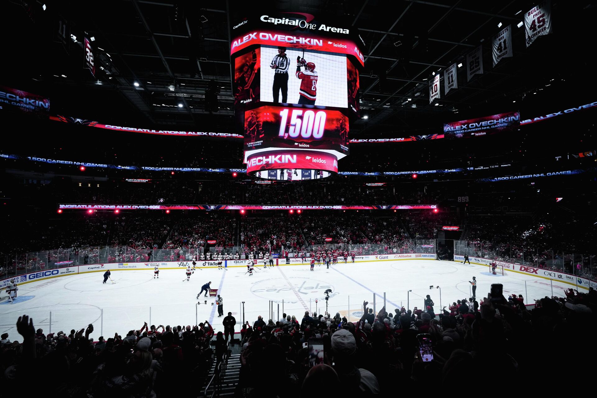 Перед традиционным исполнением гимнов США и Канады до начала игры трибуны «Кэпитал Уан Арены» в один голос кричали «Ови! Ови! Ови!», а уже по ходу встречи в первой же коммерческой паузе на медиакубе стадиона было воспроизведено поздравительное видео в честь российского рекордсмена и его достижения. В этом видео с речью в адрес Овечкина выступили Айзерман, Бурк, Лидстрем, Марло и Доун — пятеро из семи живых игроков НХЛ, кто ранее провел 1500 матчей за один клуб. Впрочем, известно, что полноценную торжественную церемонию в честь Александра Михайловича «Вашингтон» организует позже. Пресс-служба «Кэпиталз» ранее сообщила , что мероприятие пройдет перед одним из матчей и охватит не только 1500-й матч российского форварда в НХЛ, но и его 900-й гол в карьере.
