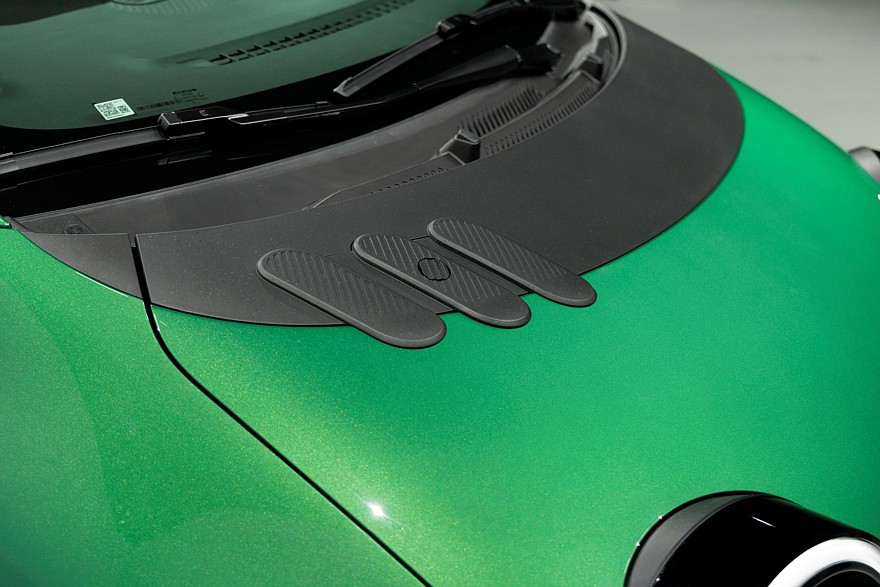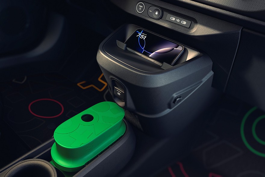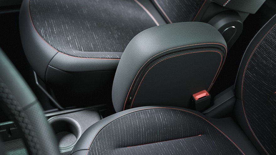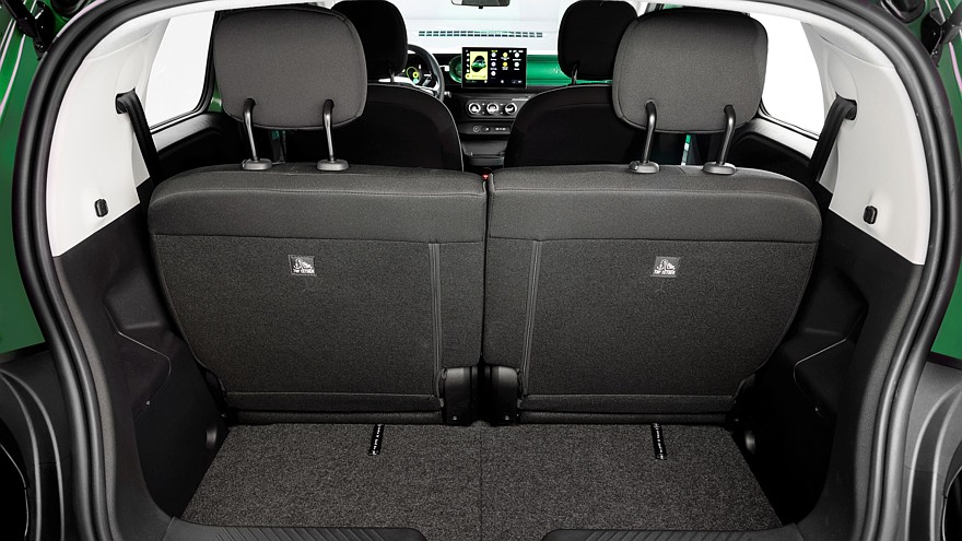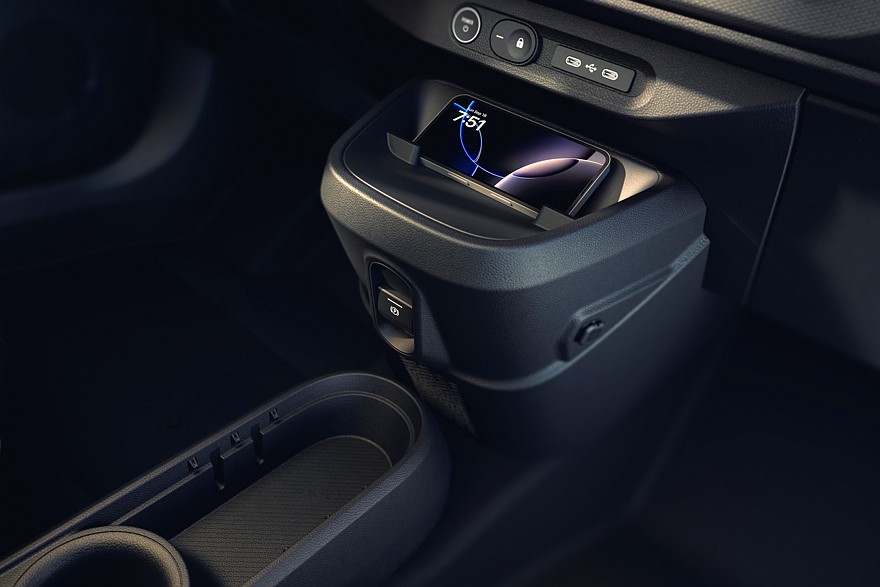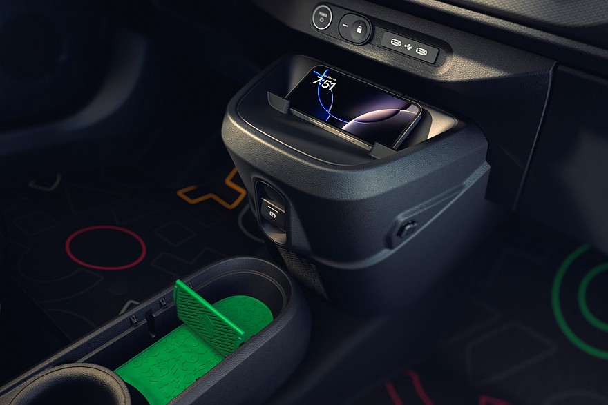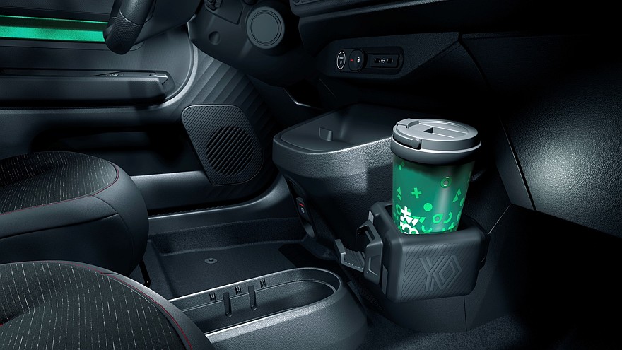 Мест для сидения всего четыре, то есть задний диван строго двухместный, зато его половинки можно двигать взад-вперёд на 17 см, чтобы сконфигурировать пространство под текущие потребности. Объём багажника — 360 л, из которых 50 л приходится на подполье, где лежит зарядный кабель. Со сложенными спинками задних сидений объём багажника увеличивается до 1000 л, но ровной погрузочной площадки не получается. Для перевозки длинномеров можно сложить ещё и спинку кресла переднего пассажира. Для мелочёвки в салоне предусмотрены различные ниши общим объёмом 19 л и различные аксессуары, предлагаемые за дополнительную плату, в том числе подстаканник и фиксатор проводов от гаджетов. Передний центральный подлокотник — это тоже, так сказать, навесное оборудование. Всё сделано так, чтобы на конвейере машины были максимально одинаковыми, а кастомизация происходила уже после сборки с помощью легко устанавливаемых дополнительных деталей.
