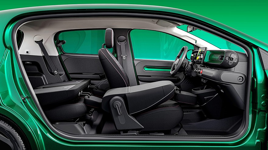 Простенький салон нового Twingo оживляют цветные вставки и пёстренький текстиль. Уже в «базе» есть цветной 7-дюймовый приборный экран и 10-дюймовый мультимедийный экран, они встречают водителя оптимистическим саундтреком, специально написанным для Twingo знаменитым французским композитором Жаном-Мишелем Жарром. Селектор режимов силовой установки выполнен в виде молоточка, торчащего из рулевой колонки справа. Кондиционер есть, а вот теплового насоса нет — дорого. Аудиосистему с шестью динамиками поставляет Arkamys.