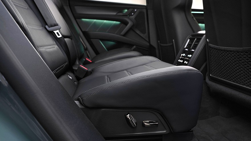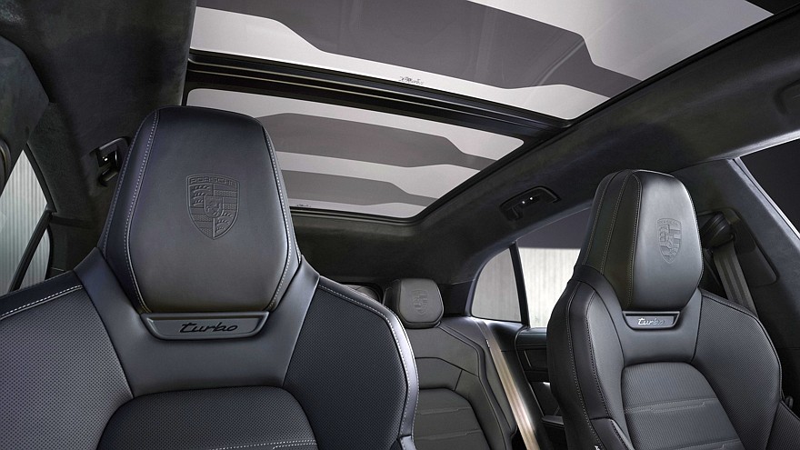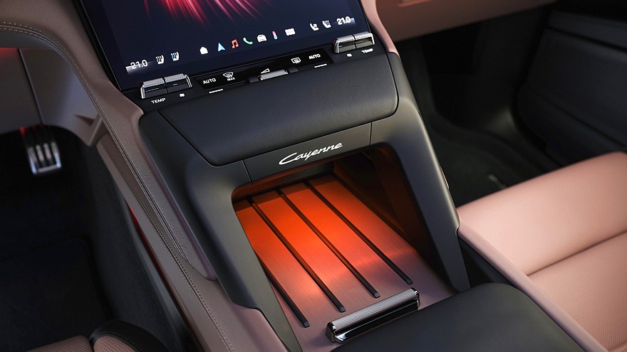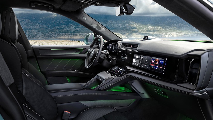 Интерьер электрического Cayenne был рассекречен ещё в сентябре и вызвал бурю негодования у ортодоксальных поклонников Porsche засильем экранов и сенсорной эргономикой — например, направление обдува теперь задаётся только через сенсорный экран, вручную дефлекторы не двигаются. Накрытый парящим козырьком изогнутый приборный экран — 14,25-дюймовый, он может быть дополнен 87-дюймовым проекционным экраном на лобовом стекле. Для переднего пассажира в виде опции доступен собственный развлекательный «телевизор» с диагональю 14,9 дюйма. Размеры ломаного и сползающего на центральный тоннель мультимедийно-настроечного дисплея в пресс-релизе не указаны. Степень прозрачности панорамной стеклянной крыши можно регулировать. Задние кресла оснащены электроприводом регулировок. Новая система климат-контроля греет не только воздух, руль и кресла, но и другие поверхности, с которыми часто контактируют руки — подлокотники и дверные карты.