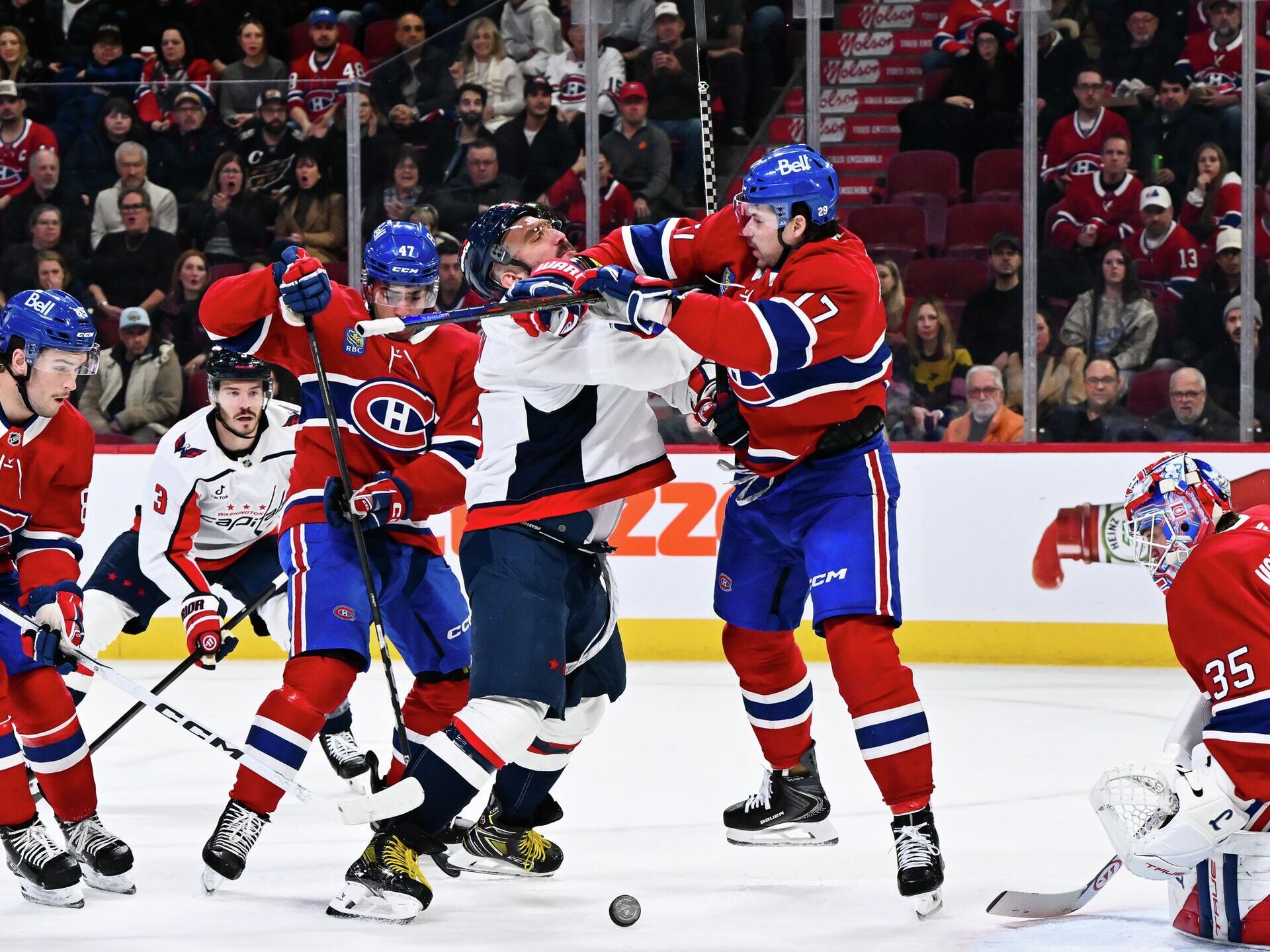 Незадолго до перерыва канадский форвард «Монреаля» Джош Андерсон излишне грубо действовал против Овечкина, приехавшего караулить зону перед чужим пятаком, и несколько раз толкнул россиянина клюшкой. Александр Михайлович не сдержался и ответил сопернику, ткнув того клюшкой, а затем вступил с ним в перепалку, которая едва не переросла в драку. За своего капитана мигом заступился Дилан Строум: он схватил игрока «Канадиенс» за шею и оттолкну в сторону, после чего развязалась массовая потасовка. Впрочем, до полноценных драк дело не дошло, а Овечкин и Андерсон обменялись еще несколькими фразами, но уже со скамейки штрафников.