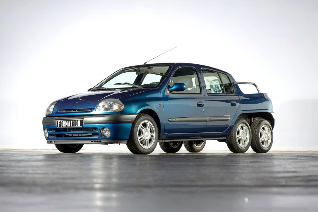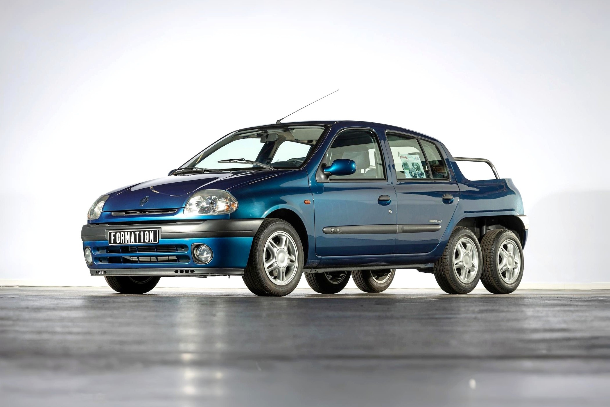 Шестиколёсный пикап на базе Renault Clio второго поколения — это учебный проект, изготовленный в качестве упражнения кузовными мастерами завода во Флинсе. Наращенная корма выглядит несколько аляповато из-за перепада высоты верхнего контура, третья ось добавлена для увеличения грузоподъёмности, хотя никаких серьёзных грузов этот пикап не возил. Машина находится на ходу, но из-за её кустарной конструкции езда возможна лишь на низких скоростях. Под капотом установлен турбодизель, мощность в карточке лота не указана, но для справки скажем что серийные дизельные версии Clio второго поколения располагали мощностью от 64 до 101 л.с.
