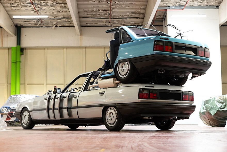 Это выглядит как полное безумие, но так и было задумано. Уинкальный Renault 21 был сделан для фильма «Леви и Голиаф» режиссёра Жерара Ури, вышедшего в прокат в 1987 году. Фильм повествует о незадачливом молодом человеке, втянутом в наркоторговлю. По сюжету фильма, алмазный порошок, который поставлялся как техническое сырьё на завод Renault в Курбевуа (это тоже пригород Парижа), заменён на схожее ко консистенции наркотическое вещество, оно попадает на конвейер, одурманивает рабочих, в результате чего они собрали показанного на фотографиях монстра с несколькими наслаивающимися друг на друга дверями и двумя кабинами, расположенными одна над другой, причём руль находится на втором этаже, а коробка передач и педали — на первом, то есть для управления нужны минимум два человека. За основным капотом с двигателем находится второй открытый моторный отсек с месивом из различных деталей и механизмов. Короче говоря, боди-хоррор из 1980-х в приложении к автомобилям выглядит именно так.