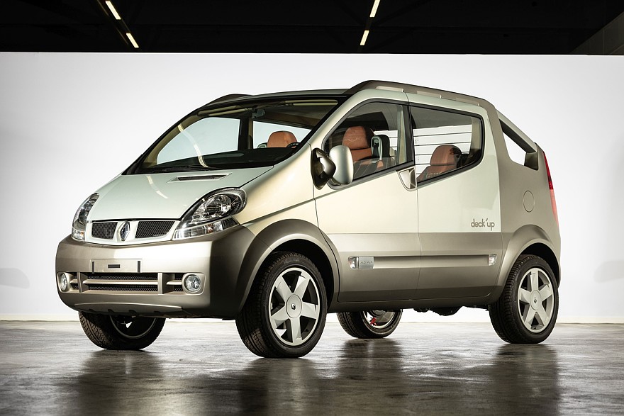 Поразительный сплав кроссовера, фургона и пикапа. Концепт Renault Trafic Deck’Up выставлялся на Брюссельском автосалоне 2004 года, в его основе лежит укороченный фургон Trafic 2020 года выпуска с 2,5-литровым турбодизелем (135 л.с.) и полным приводом. Задние двери открываются в противоположную передним сторону, центральные стойки кузова выпилены. В салоне установлены четыре поворотных кресла повышенной комфортности, а в коротенькой открытой части кузова в корме имеются две откидные боковые сидушки. Перегородка между салоном и грузовой площадкой полностью прозрачная.