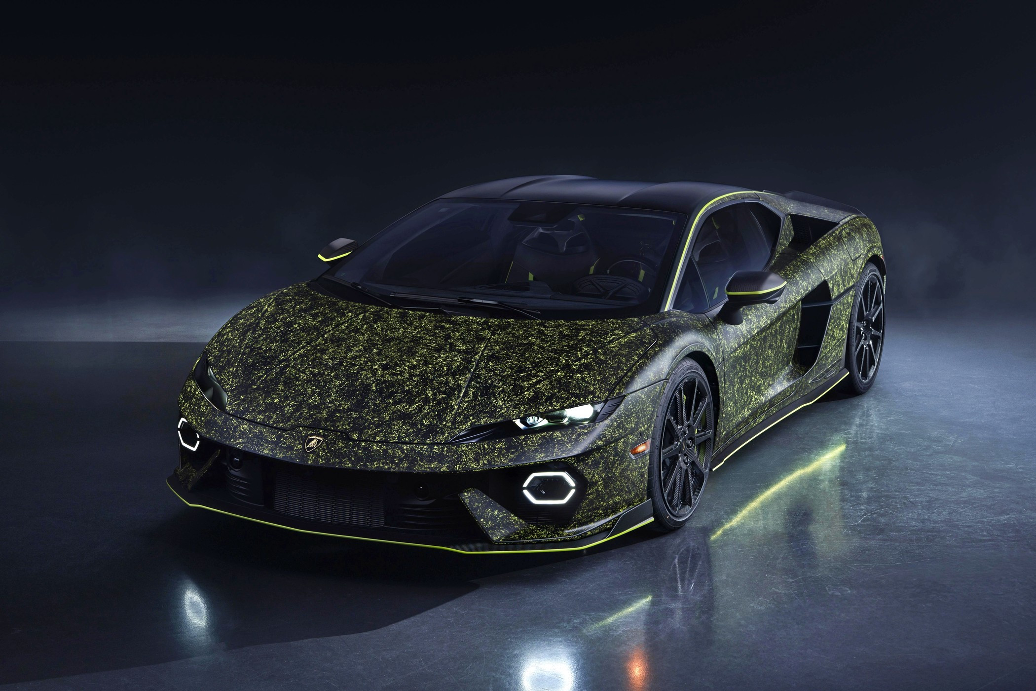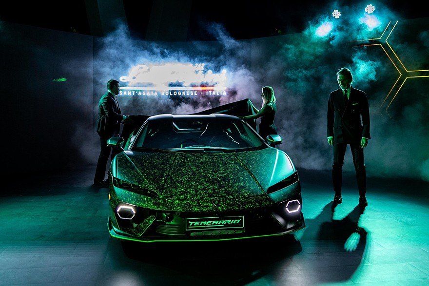 Главная фишка представленного в Майами суперкара — кристаллическая окраска, сделанная на базе трёх цветов — желто-зелёного Verde Shock, серого Grigio Maat и чёрного Nero Nemesis. На создание причудливого узора потребовалось 320 часов ручной работы — это много, но, помнится, окраска в похожем ключе юбилейного Lamborghini Huracan Sterrato Opera Unica потребовала ещё больше времени — более 370 часов. Уникальная окраска отлично сочетается с углепластиковым обвесом из опционального пакета Alleggerita, позволяющего уменьшить снаряженную массу Temerario на 25 кг.