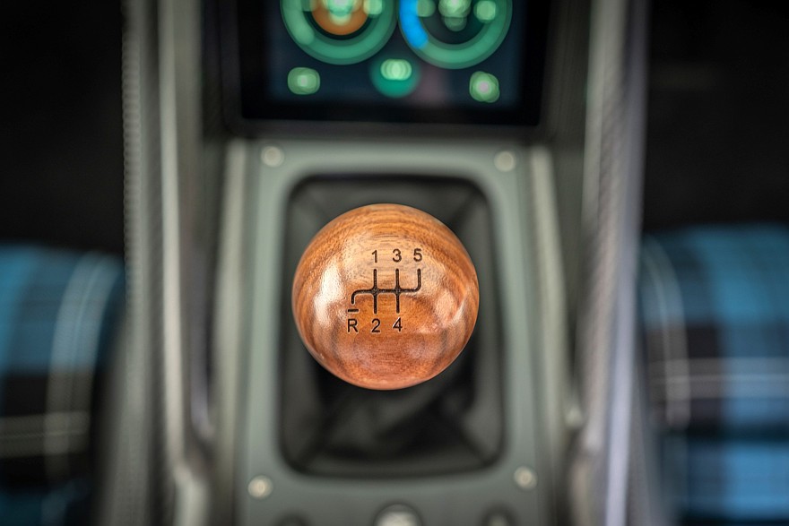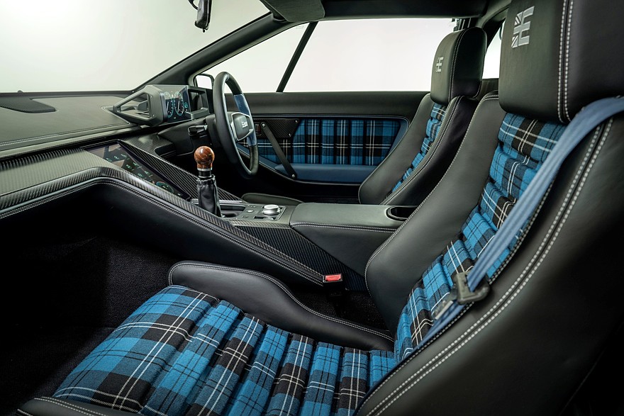 Салон тоже полностью новый, с куда более высоким качеством изготовления, чем у оригинального Lotus Esprit, при этом сохранены исходная геометрия посадки и дух 1970-х, подчёркнутый лаконичной передней панелью, текстильными вставками в крупную клетку и двухспицевым рулём. Аналоговый щиток приборов заменён электронным от компании Skyships, но он показывает классические стрелочные циферблаты. Врезанный в центральную консоль мультимедийный экран тоже поставляет Skyships, перед ним находится массивный рычаг переключения передач с деревянным набалдашником. Устаревший кондиционер заменён современной системой климат-контроля.
