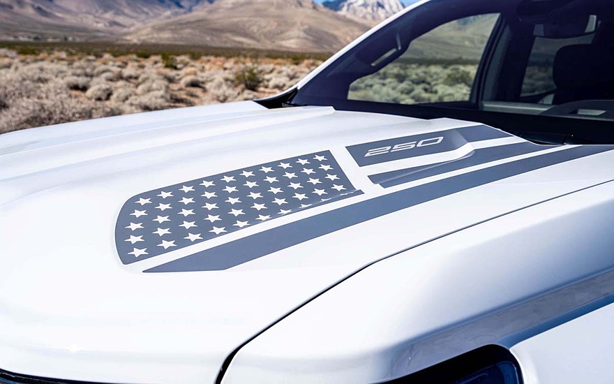 Юбилейный вариант есть и у полностью электрической версии пикапа: в основе Silverado EV Stars & Steel лежит исполнение RST Crew Cab. Кузов может быть чёрным или белым, рисунок такой же – с полосами и звёздами, а в комплект предлагаются 24-дюймовые «катки», чёрные шильдики и новая тормозная система Brembo с увеличенными дисками и шестипоршневыми передними красными суппортами.