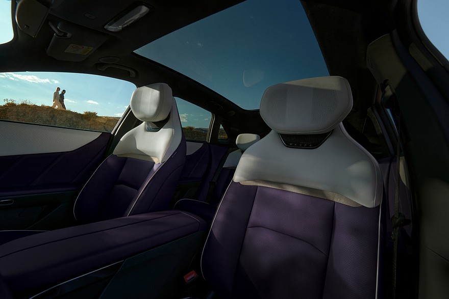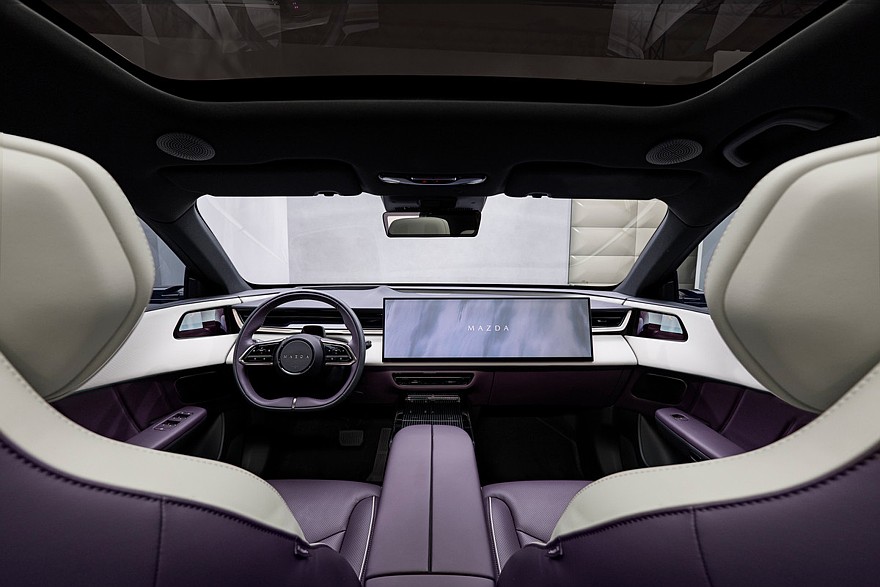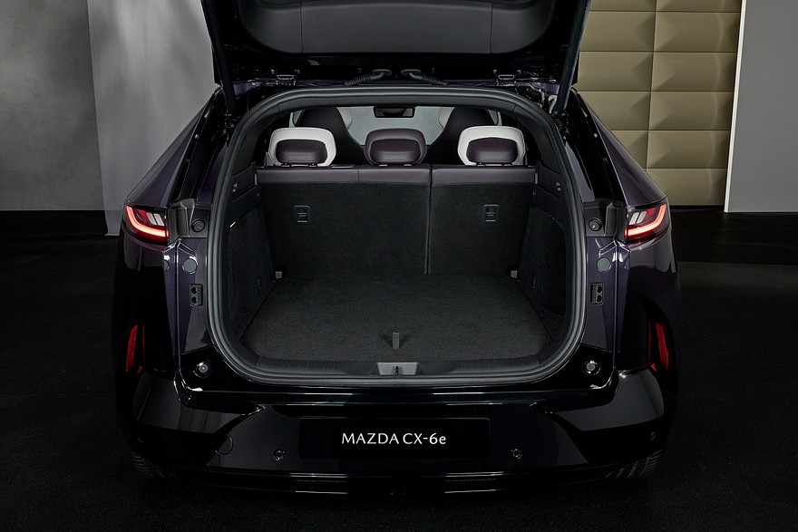 Габариты у версий для Китая и Старого Света одинаковые. Длина Mazda CX-6e равна 4850 мм, ширина – 1935 мм, высота – 1620 мм, колесная база – 2902 мм. Для новинки предусмотрены 19- или 21-дюймовые диски. Паспортный дорожный просвет CX-6e – 158 мм. Объем багажника составляет 468 литров, со сложенным вторым рядом кресел – 1434 литра (для EZ-60 заявлены другие показатели, но разница может объясняться другой методикой измерения).