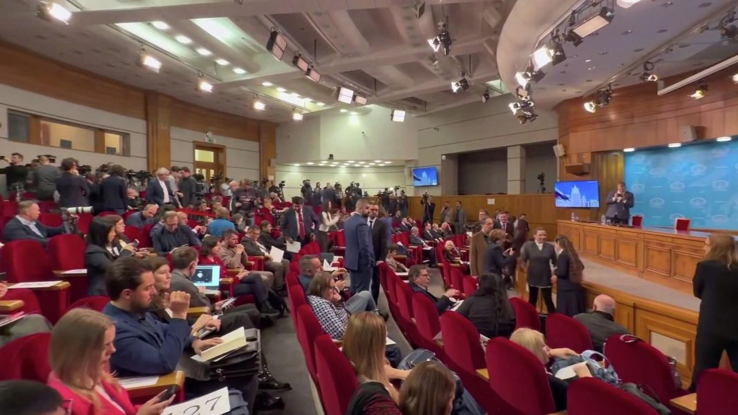 Зал, рассчитанный примерно на 300 человек, практически полностью заполнен российскими и зарубежными журналистами.