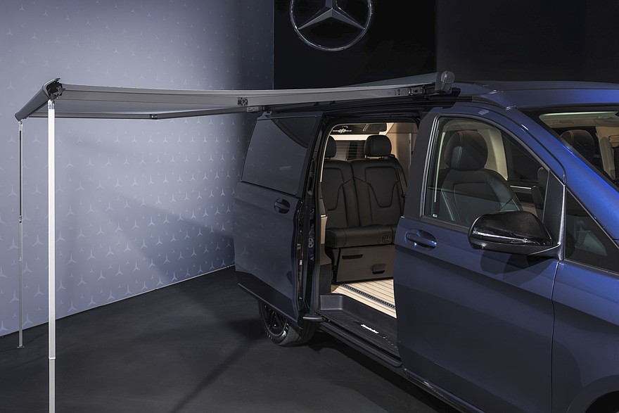 В пресс-службе марки рассказали о том, что «глэмпинг-мобиль» получил новую выдвижную крышу с электроприводом, которая обеспечивает спальное место в верхней части автомобиля. Она имеет прочный и лёгкий алюминиевый каркас с двойной обшивкой. Такая «палатка» остаётся изолированной практически при любых погодных условиях, кроме того, теперь у неё есть дополнительный запас высоты на 10 см (когда задняя секция поднимается на полную высоту).