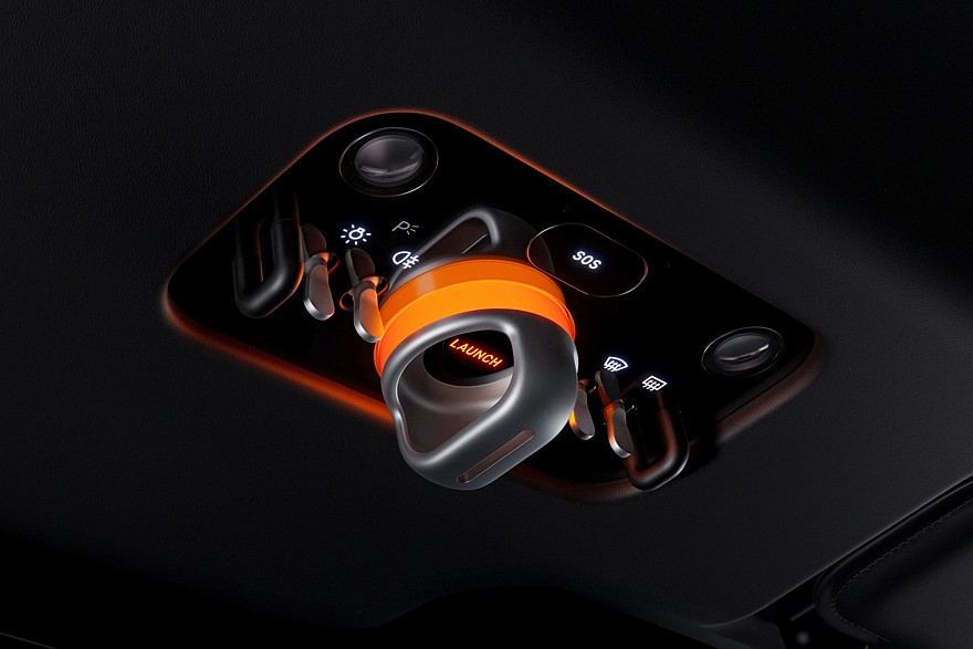 На верхней поверхности центрального тоннеля разместился маленький селектор режимов трансмиссии, выполненный в виде стеклянного цилиндра с подсветкой, он ходит по L-образному пазу. Слева от селектора находится слот для ключа. В ключ встроен экран с электронными чернилами, он подсвечивается и меняет цвет, когда ключ попадает в слот.