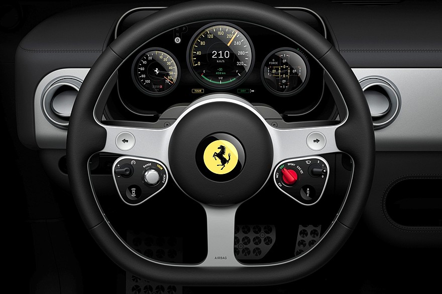 Команда LoveFrom разработала не только формы салона Ferrari Luce, но и весь графический интерфейс, и здесь действительно много цитат из Apple, но с поправкой на автомобильную специфику. Большинство не обитых кожей поверхностей, с которыми контактируют руки, выполнены из анодированного алюминия и устойчивого к царапинам стекла — всё, как у Apple.