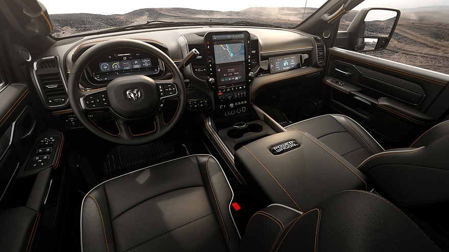 В салоне «лунных» версий Ram 2500 Power Wagon и Rebel тоже есть свои особенности. Так, грузовики получили другие передние кресла, отделанные чёрной натуральной кожей с тиснением в виде названий исполнений и контрастной оранжевой прострочкой. Аналогичным образом оформлены передняя панель, дверные карты, рулевое колесо, центральный тоннель и другие элементы интерьера.