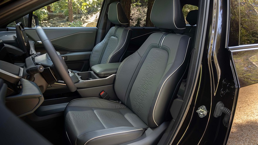 Subaru Getaway получил свою головную оптику с узнаваемыми светодиодными штрихами ходовых огней (схожим образом оптика оформлена у других «электричек» бренда), умеющими показывать уровень зарядки при подключении к устройству, и основными блоками фар, которые расположены ниже. Между ними располагается довольно крупный «звёздный» логотип, имеющий подсветку во всех исполнениях.