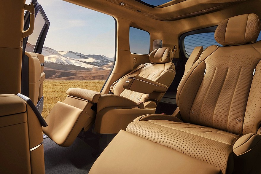 Салон у Xpeng GX трёхрядный с посадочной формулой 2+2+2. Кресла первых двух рядов имеют огромное количество регулировок и встроенные массажёры. Комплектация по умолчанию очень богатая, в неё входят, например, отделка натуральной кожей наппа, мощная аудиосистема с 33 громкоговорителями, холодильник и встроенный в крышу откидной 21,4-дюймовый развлекательный монитор для пассажиров второго и третьего рядов. Передняя панель довольно скромная по части экранов: приборный имеет диагональ всего 8,8 дюйма, но он дополнен 88-дюймовым проекционным экраном на лобовом стекле, центральный мультимедийный экран — 17,3-дюймовый. Объём основного багажника при всех задействованных местах — 673 л, у электрической версии есть дополнительный передний багажник объёмом 109 л.